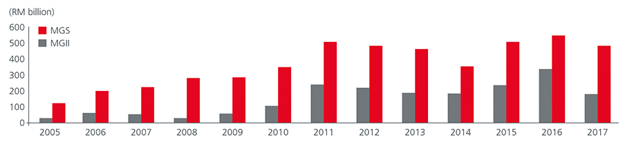 The strong demand for MGII from domestic and foreign investors is reflected in the healthy bid-to-cover ratios at MGII auctions. New issues of MGII have on average enjoyed a bid-to-cover ratio of 2.21 times in 2017, slightly above MGS’ average ratio of 2.11 times.