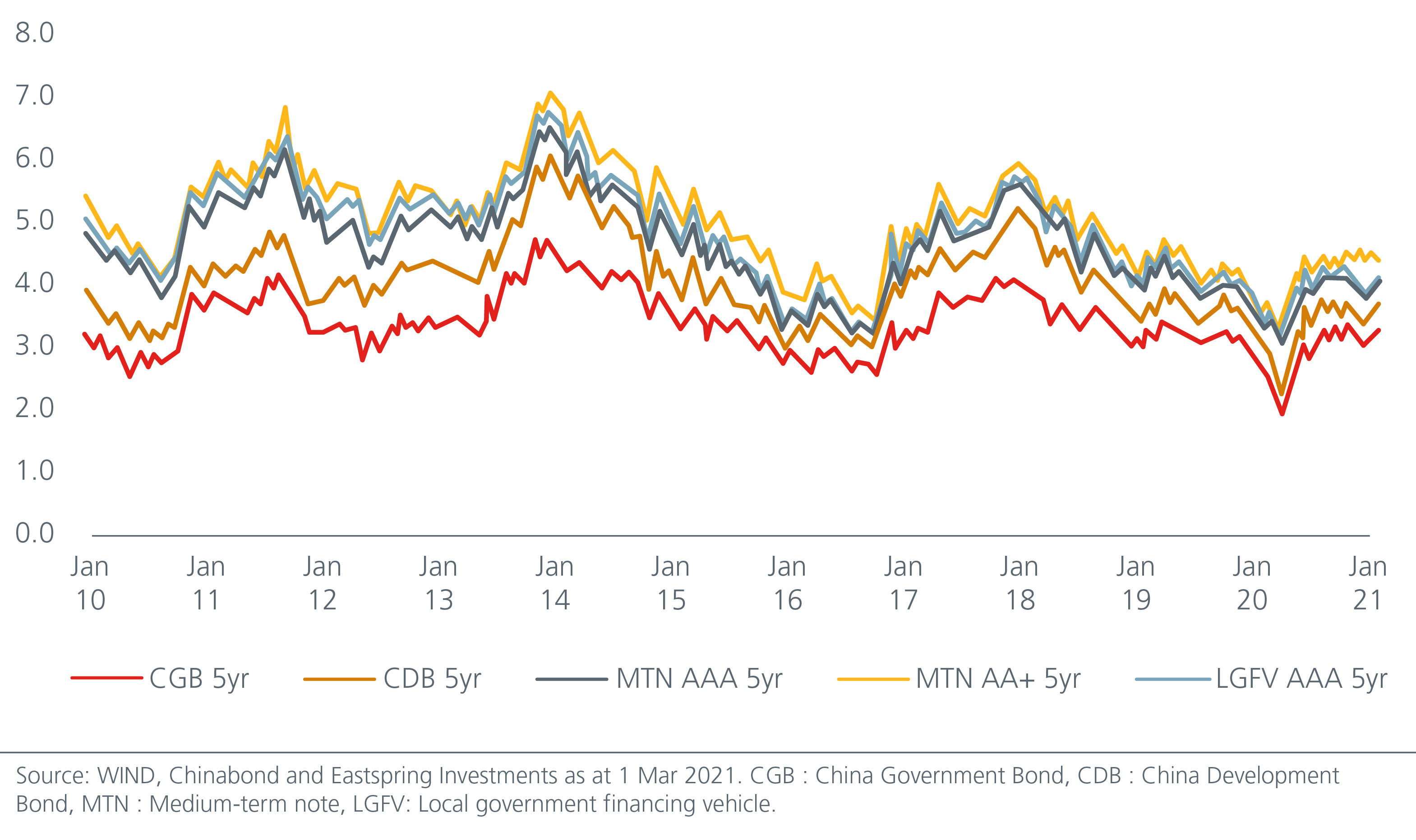 China onshore bonds also offer good relative value over their offshore counterparties. The China Bond Corporate Bond AAA Index (5-year) had a yield to maturity of 3.8% at the end of February, much higher than the 2.6% yield of offshore investment-grade bonds. The gap has widened significantly since the second quarter of 2020, when the Chinese government began to tighten onshore monetary conditions. For SOEs with international ratings of A- and above, the gap between their RMB bonds and USD bonds can be as wide as 200bp, without factoring in the cost of hedging and FX differences, making high-quality SOE bonds attractive for investors looking for yield enhancement. See Fig 4. As the effect of policy normalisation fades, the yield premiums on onshore bonds may eventually fall closer to historical levels, which means better returns for onshore bond investors.