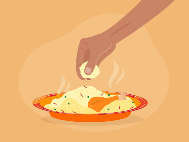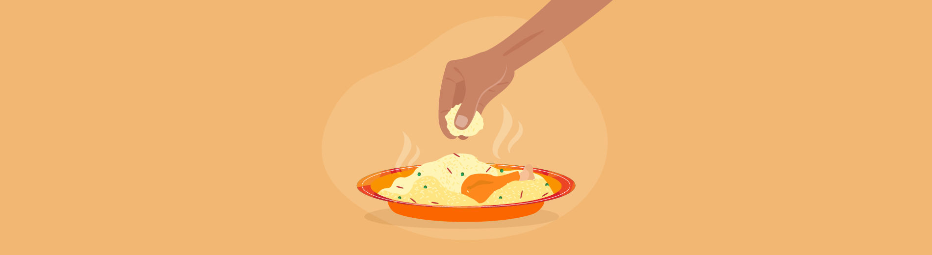 It is customary that when eating with hands, all five fingers have to be touching. This, it is said, creates an amalgamation of all the elements and imbues the food with cosmic energy1. This is said to create a physical, emotional and spiritual connection between you and the food!
