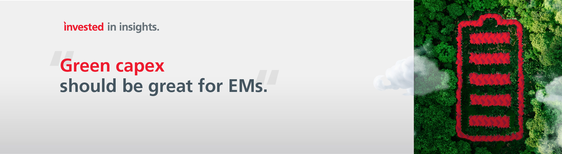 Ultimately the point to note is the green capex spending is going to increase as we get closer to the net-zero targets. Moreover, over the last 10 years, companies in both developed and emerging markets have been under-investing in physical assets (property, plant & equipment) and directing the spending to intangibles, particularly in mergers and acquisitions. As the green capex spend requirements increase, this trend will reverse with the new spend going to hard assets. Emerging Markets (EMs) are well placed to benefit given that they are global manufacturing bases.